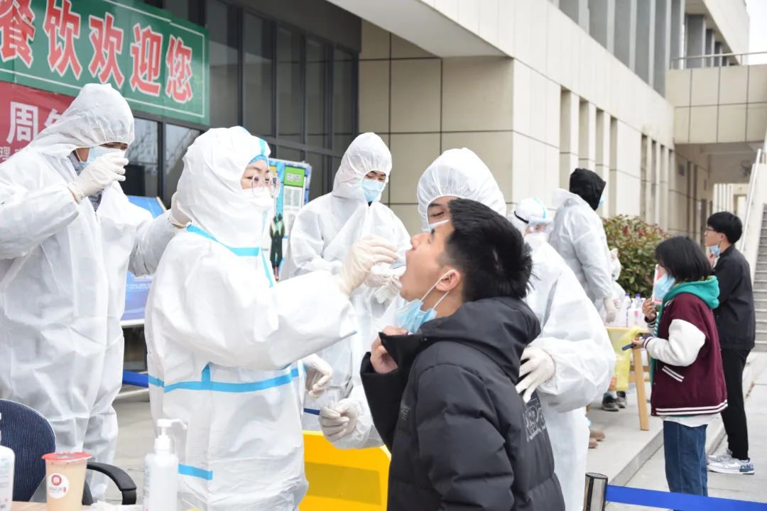 全体学生在现场老师的安排下以班级为单位顺序展开核酸检测工作。