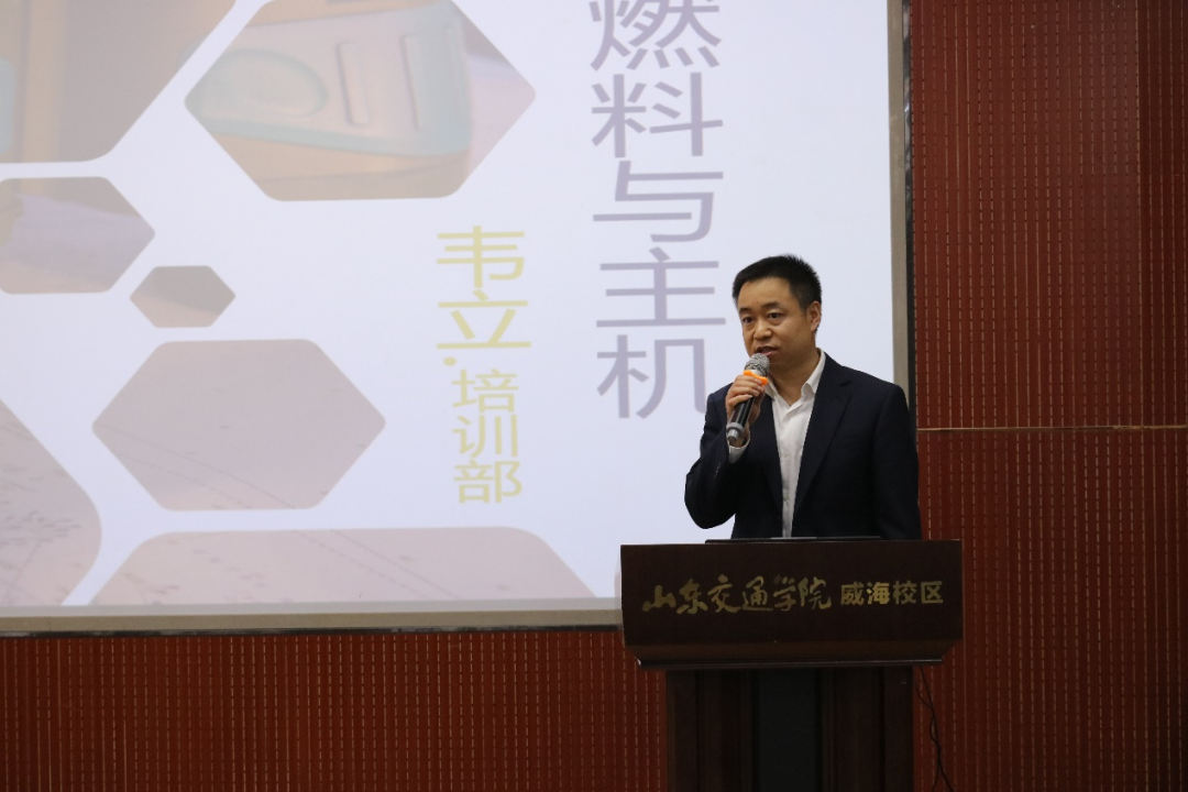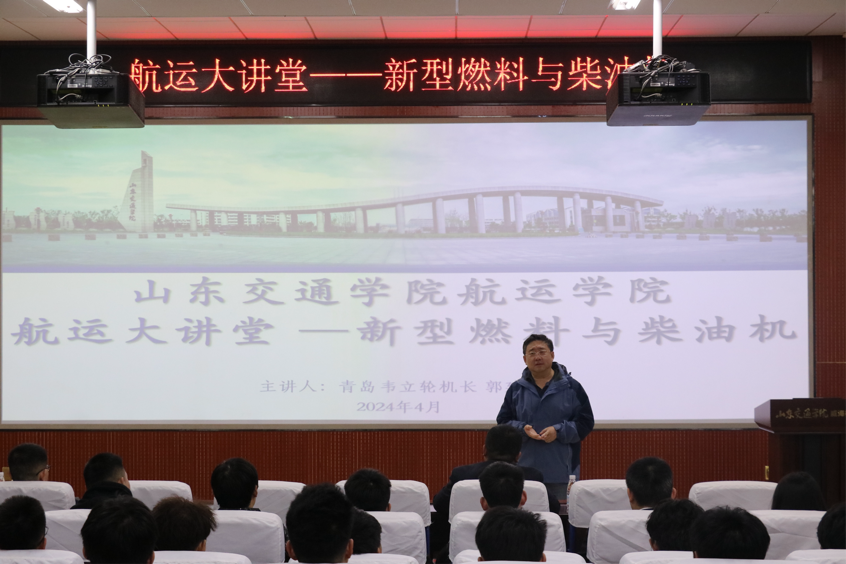 在威海校区第二报告厅举办“航运大讲堂”--新型燃料与柴油机讲座,本次活动邀请青岛韦立国际船员管理有限公司轮机长郭建刚担任主讲嘉宾,燕雨直播