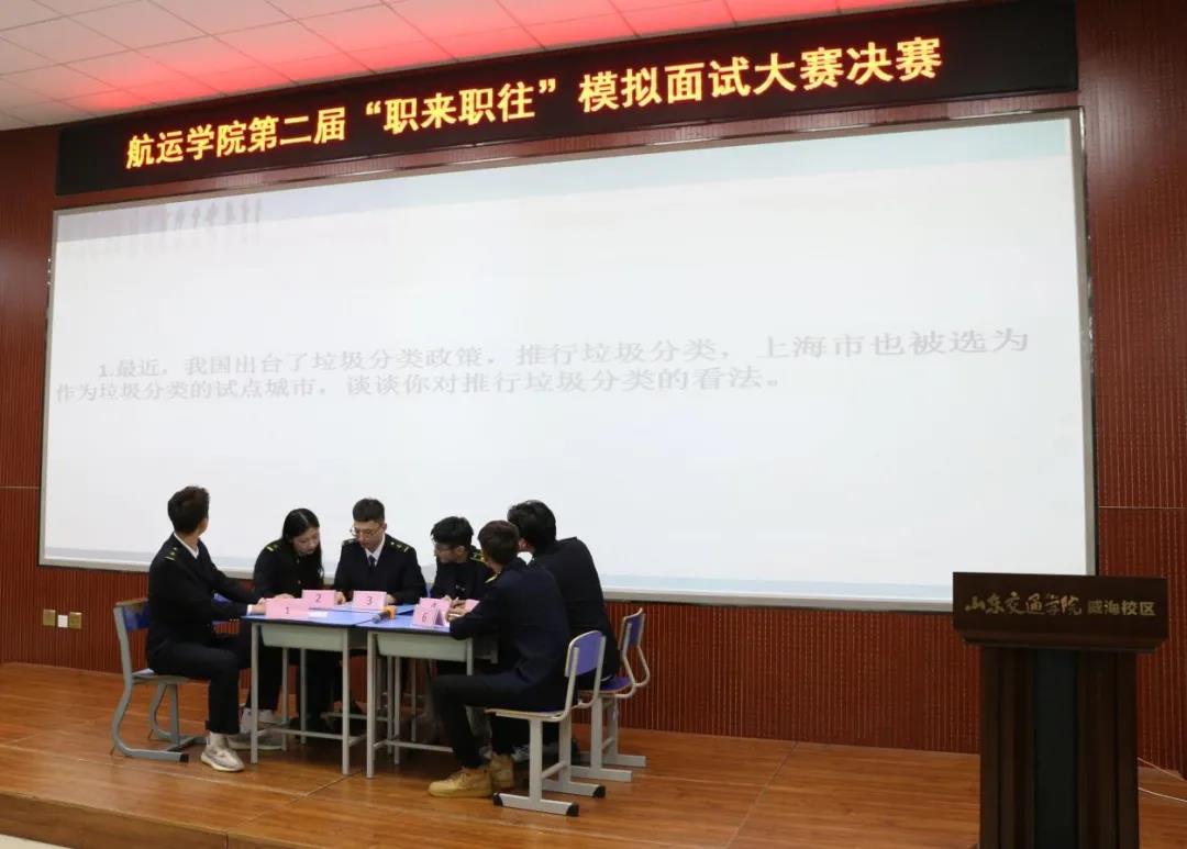 辅导员李丽丽老师、陶远城老师、张敏老师及六位团队导师担任比赛评委。面试采取结构化面试形式,模拟公务员面试题目,分为综合分析、人际交往、情景处理、社会现象分析等几类题目。题目命制紧跟国家时事政策、社会发展趋势以及职场的突发事件等,如试点推行垃圾分类、老年人不会使用健康二维码、海上执法人员与船员冲突、船舶事故后的舆情处理等。现场6支团队随机抽取两道题目,在规定时间内思考、讨论并由本组代表同学回答问题。每组同学回答完毕后,九位评委分别针对每组同学的举止礼仪、言语表达、答题思路等方面进行点评,并深入解读面试问题,引导同学们培养辩证观点及透过现象抓本质的能力。