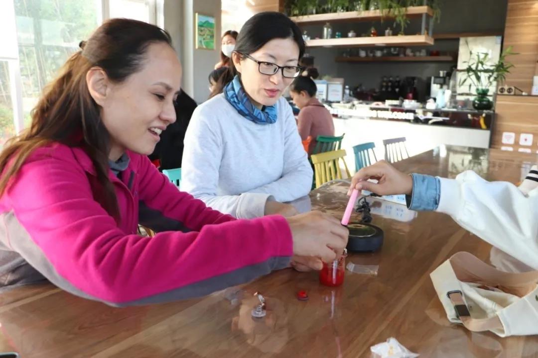 “唇”天然口红DIY活动更是吸引了女老师们前来体验。手工老师为大家详细介绍了口红的制作材料、工具及制作流程,从精油称量,到色粉的混合搅拌,到蜂蜡加热融化搅拌,再到融化倒模、冷却脱膜,最后到外形包装,大家紧随老师的步骤,用心制作个人专属口红。当第一支DIY口红制作成功时,一声声赞叹从人群中传出,“哇!这也太好看了叭!”爱美的女老师们,手捧自己亲手制作的口红,纷纷拍照留念,脸上洋溢着幸福的笑容。