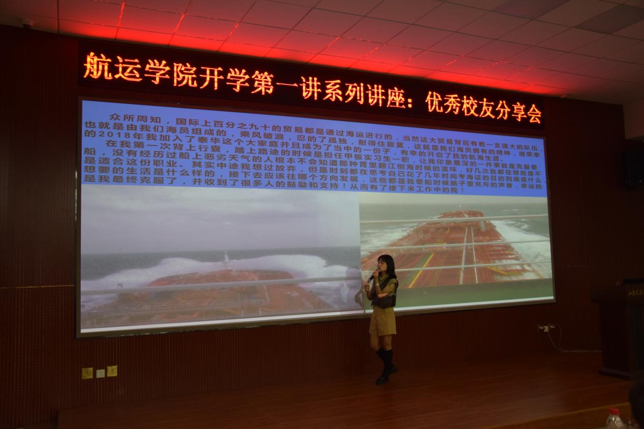 师生开展以“老刘说船长”为题的专题讲座。刘船长从个人航海经历讲起,介绍了海员的生活、航海的工作环境、航海文化的习俗。2019届优秀毕业生郑国梁在威海校区第二报告厅作“优秀校友分享会专题讲座”。郑国梁表达了对母校和老师们辛勤培养的感激之情,接着从成长经历、心得感悟、几点建议三个方面帮助师弟师妹们了解航海类专业知识的实际应用,更加熟悉未来就业环境,做好职业发展规划。